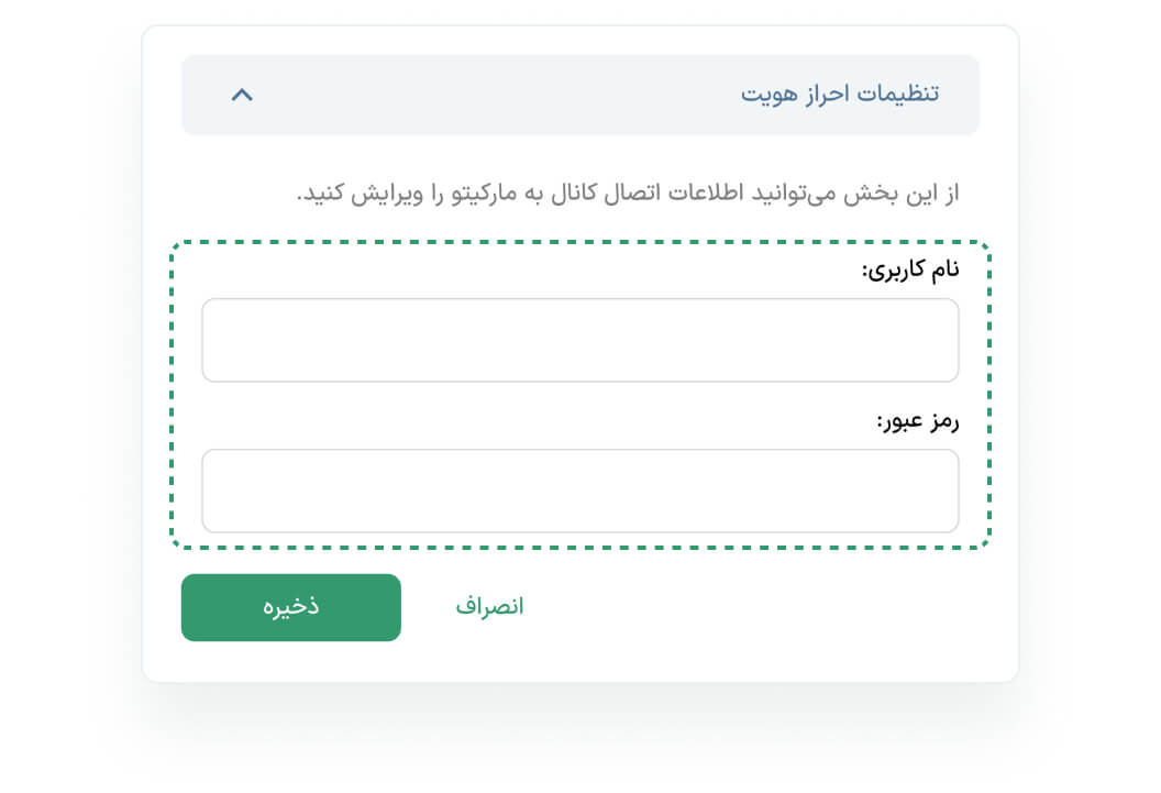 نام کاربری و رمز عبور کاربر ایجاد شده را به ترتیب در نام کاربری و رمز عبور از قسمت تنظیمات احراز هویت مارکیتو خود وارد و روی گزینه «ذخیره» کلیک کنید.