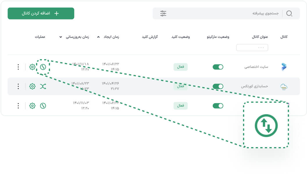 پس از اتصال کانال فروشگاه اختصاصی خود به مارکیتو، وارد قسمت کانالها از صفحه تنظیمات شوید و با کلیک روی عمل انتقال را انجام دهید.