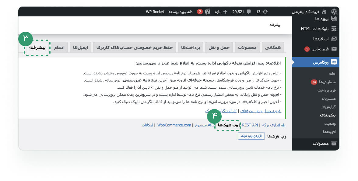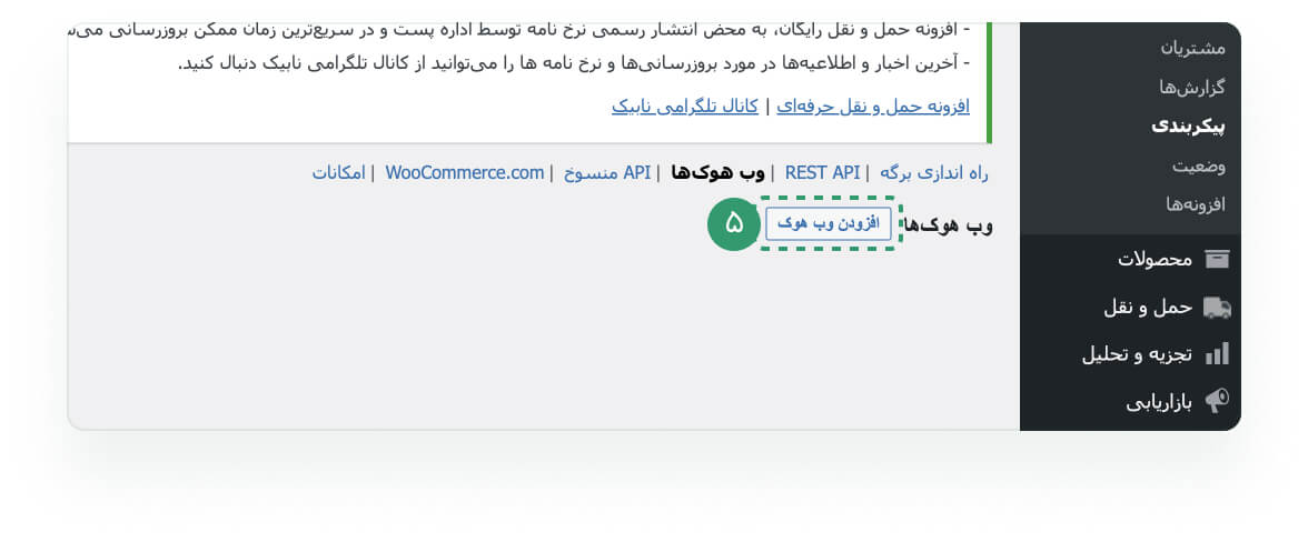 ووکامرس > پیکربندی > پیشرفته > وب هوکها