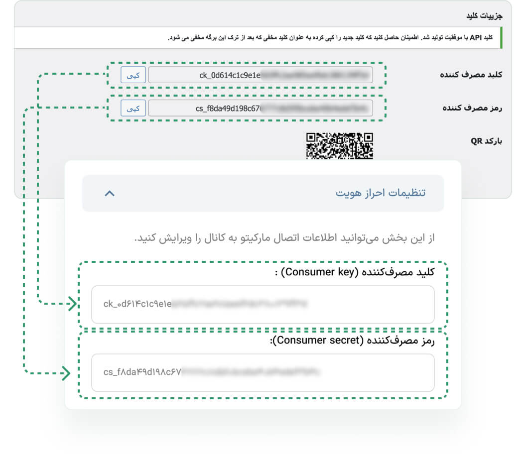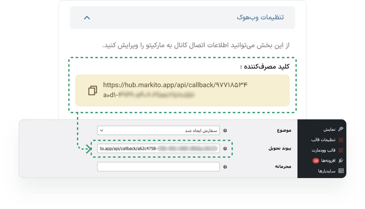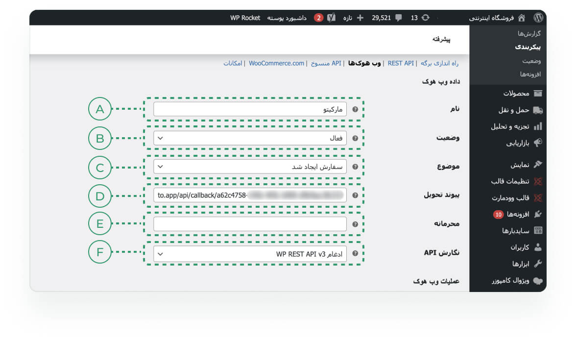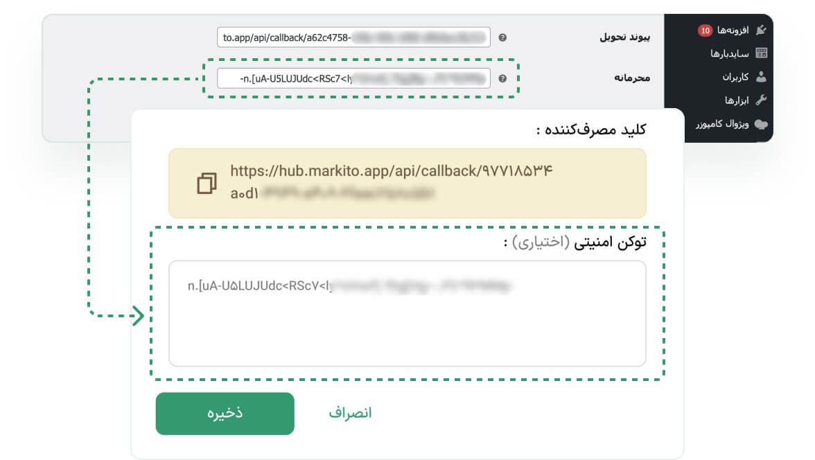 - این بخش پس از ذخیره وب هوک، توسط ووکامرس ایجاد میشود و شما باید پس از ذخیره، توکن امنیتی ایجاد شده در این بخش را کپی و در قسمت توکن امنیتی مارکیتو از تنظیمات مربوط به کانال مورد نظر وارد کنید.
