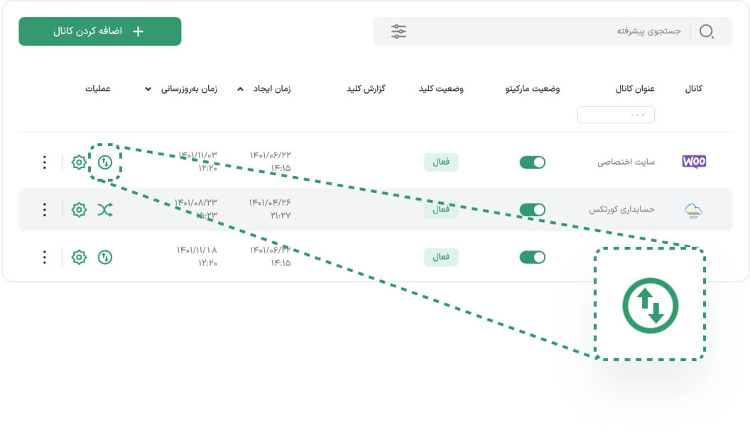پس از اتصال کانال فروشگاه اختصاصی خود به مارکیتو، وارد قسمت کانالها از صفحه تنظیمات شوید و با کلیک روی عمل انتقال را انجام دهید.