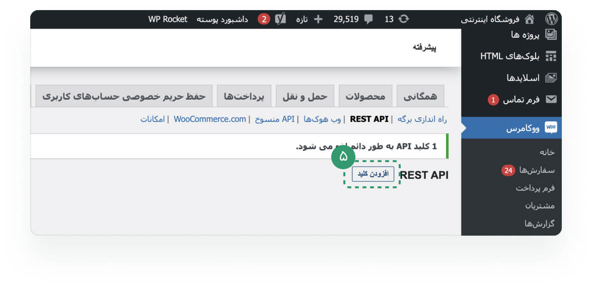 در مرحله بعدی باید کلید REST API را بسازید و برای این کار روی گزینه «افزودن کلید» کلیک کنید