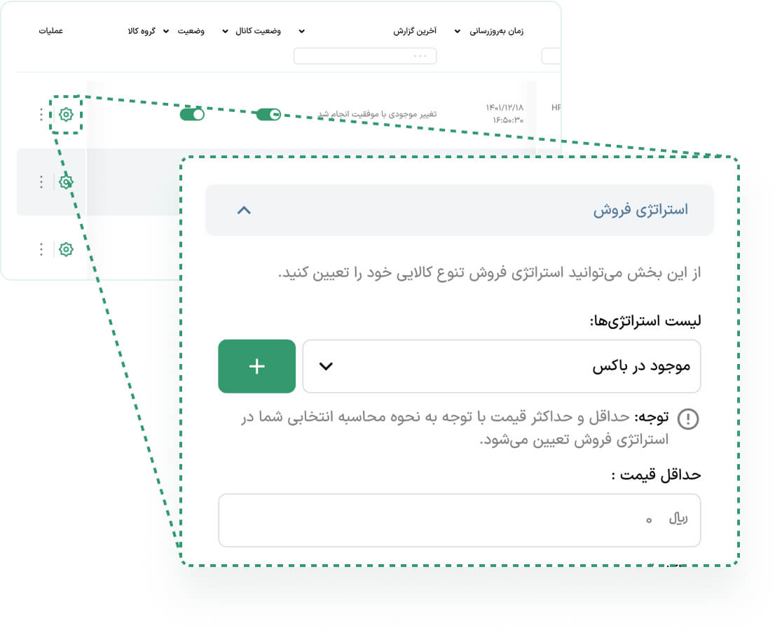 پس از ساخت استراتژی فروش، وارد صفحه لیستها شوید و با کلیک روی از ستون عملیات وارد تنظیمات تنوع کالایی مورد نظر خود شوید و سپس در بخش استراتژی فروش، استراتژی مورد نظر خود را انتخاب و روی گزینه «ذخیره» کنید.