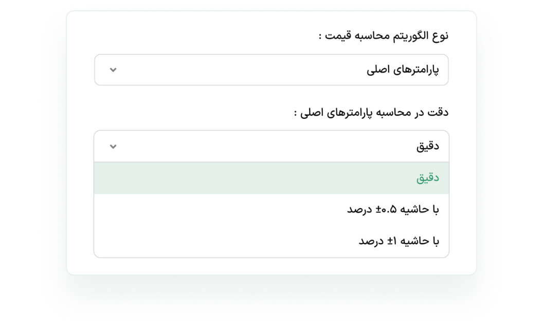 این قابلیت با انتخاب گزینه «پارامترهای اصلی» فعال میشود و میتوانید میزان دقت الگوریتم محاسبه قیمت را بر اساس سه گزینه «دقیق» و «با حاشیه 0.5± درصد » و «با حاشیه 0.1± درصد» تعیین کنید.