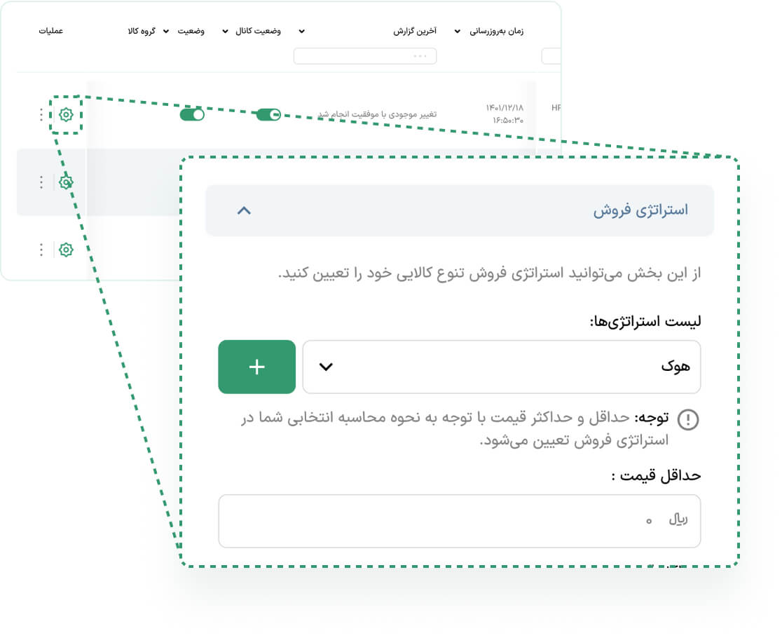 پس از ساخت استراتژی فروش، وارد صفحه لیستها شوید و با کلیک روی از ستون عملیات وارد تنظیمات تنوع کالایی مورد نظر خود شوید و سپس در بخش استراتژی فروش، استراتژی مورد نظر خود را انتخاب و روی گزینه «ذخیره» کنید.