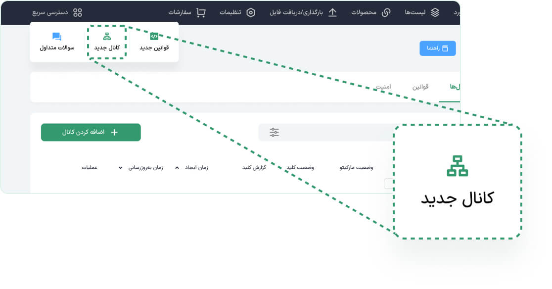 با کلیک روی گزینه «اضافه کردن کانال» در قسمت کانالها از صفحه تنظیمات و یا با کلیک روی گزینه «انتخاب کانال جدید» از منو دسترسی سریع، میتوانید کانالهای مختلفی را به مارکیتو اضافه کنید.