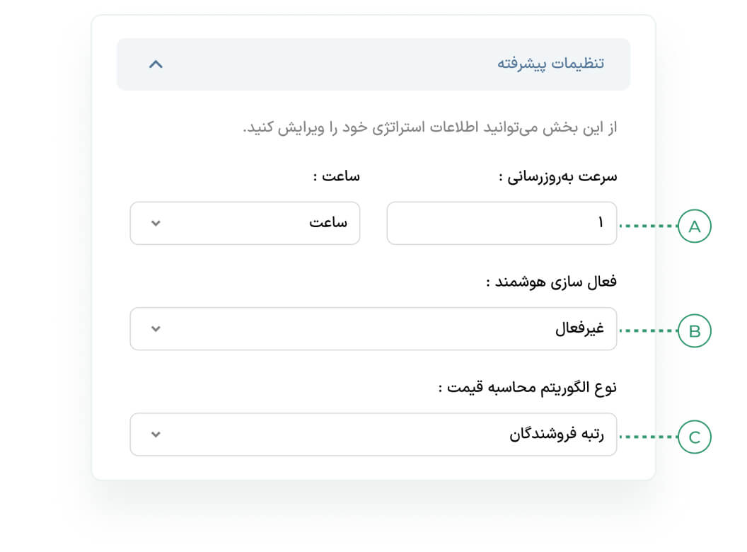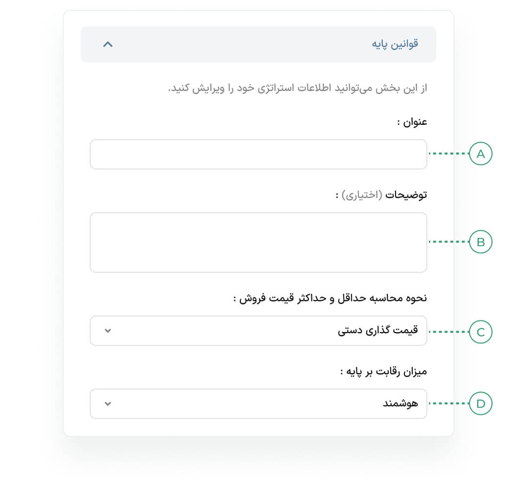 از این بخش میتوانید اطلاعات اصلی استراتژی خود شامل عنوان، توضیحات، نحوه محاسبه قیمت فروش و میزان رقابت در آن را تکمیل کنید.