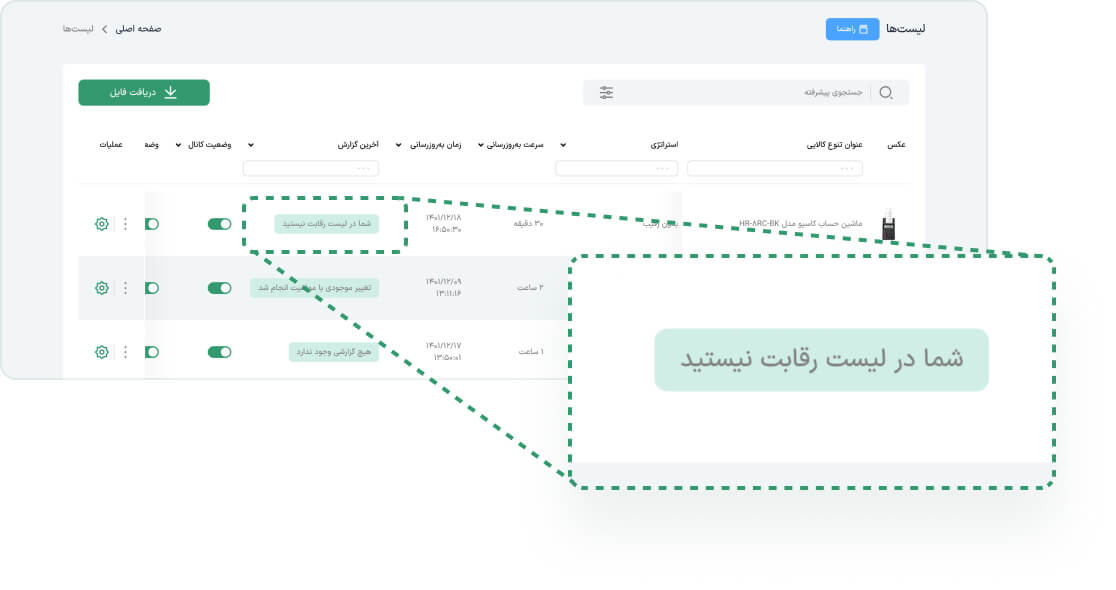 ممکن است بنا به دلایلی شما از لیست فروشندگان تنوع کالایی مورد نظر خود حذف شوید. در این حالت شما پیغام «شما در لیست رقابت نیستید» را در آخرین گزارش تنوع کالایی خود در صفحه لیستها مشاهده میکنید.