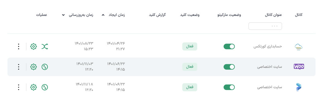 با کلیک روی از ستون عملیات در جدول کانالها میتوانید تنظیمات کانال حسابداری مورد نظر خود را تکمیل و یا ویرایش کنید و سپس با کلیک روی گزینه «ذخیره» اطلاعات خود را ثبت کنید. در ادامه به بررسی جزئیات این قسمت می پردازیم.
