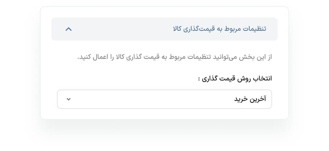 از این بخش میتوانید نحوه قیمت گذاری قیمت خرید تنوع کالایی خود را از بین چهار روش «آخرین خرید»، «میانگین موزون (متحرک)»، «اولین صادره از اولین وارده (FIFO)»، «آخرین صادره از اولین وارده (LIFO)» انتخاب کنید.
